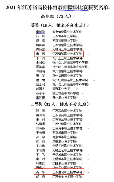 近日,江苏省教育厅公示了2021年江苏省高校体育教师微课教学比赛获奖名单,beats365官方网站申可、肖华两位老师分别获得高职组一等奖和三等奖。