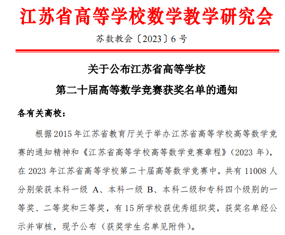 近日,由江苏省高校数学教学研究会组织,南京工业大学浦江公司承办的江苏省高等公司第二十届高等数学竞赛圆满落下帷幕,公司beats365官方网站高等数学竞赛队共获得江苏省专科组一等奖12项,二等奖25项,三等奖29项,本科组二等奖1项。