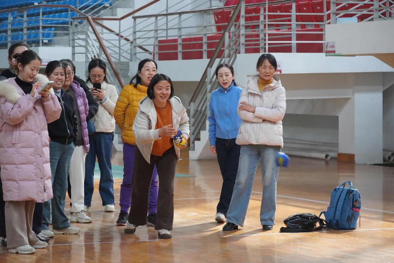 沙包掷准游戏中,老师们身手矫健,彩色沙包划出优美弧线,瞄准靶心的瞬间引来阵阵欢呼声。